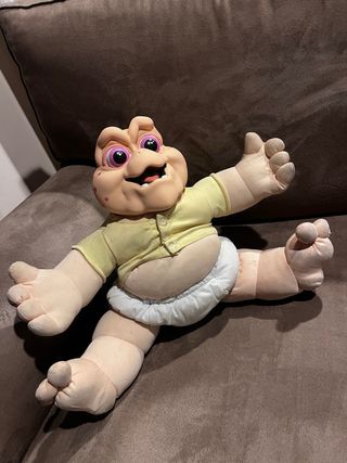 Figura del bebé Sinclair de Dinosaurios. Adorable peluche de coleccionismo del bebé Pequesaurio o bebé Sinclair de la serie de los años 90 Dinosaurios de Disney. No funciona el sistema de cuerda con el que hablaba, desconozco si tiene arreglo. Tiene manchas que imagino se pueden eliminar
