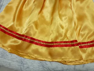 Disfraz de princesa para niñas, inspirado en un cuento clásico. - Cuerpo superior de terciopelo azul con detalles. - Mangas abullonadas en azul y rojo. - Falda amplia de satén amarillo. - Adorno de cinta roja y dorada en el bajo de la falda.