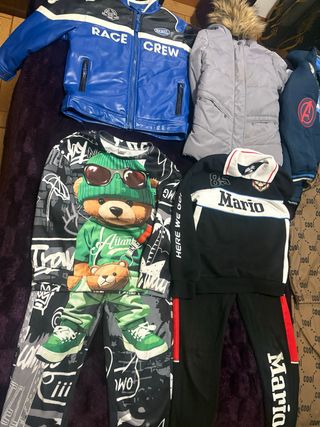 Lote de ropa para niño de 5 a 6 años. - Chaqueta azul Race Crew. - Chaqueta gris acolchada con capucha. - Conjunto de sudadera y pantalón con estampado de oso. - Conjunto de sudadera y pantalón Mario. - Chaqueta azul con logo de Avengers.