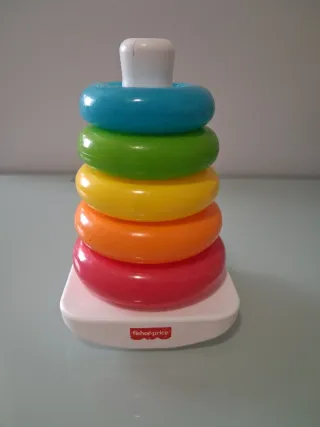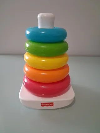 Juguete clásico de apilamiento con anillos de colores. - Base blanca. - Anillos de colores: rojo, naranja, amarillo, verde y azul. - Palo blanco en la parte superior.