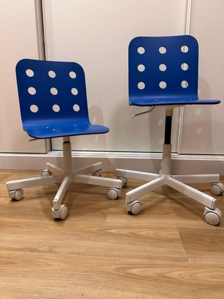 Conjunto de dos sillas infantiles con asiento y respaldo de color azul, con agujeros decorativos. La altura de las sillas es regulable. - Base de 5 ruedas para mayor estabilidad. - Estructura blanca.