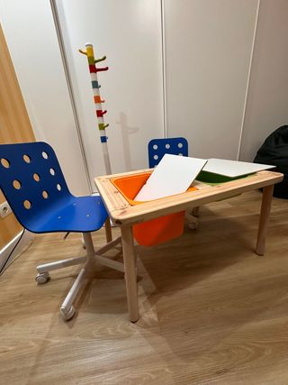 Conjunto de mesa y sillas infantiles de Ikea, ideal para actividades. - Mesa de madera con espacio para dos cajas de almacenaje. - Incluye dos cajas de plástico de color naranja. - Dos sillas infantiles de color azul con ruedas. - Un perchero de pie con varios ganchos de colores.