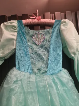 Disfraz de sirenita, ideal para fiestas o juegos. Tiene unas pequeñas manchas en el tul de la manga izquierda. Se observa en la foto. Por lo demás está como nuevo. - Talla 130 cm. 6-8 años - Diseño inspirado en la Sirenita. - Mangas abullonadas. - Falda de tul multicapa. - Detalle de concha en el pecho.