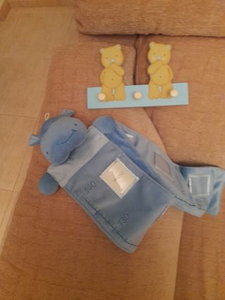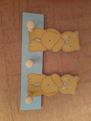 Perchero o colgador para dormitorio infantil y peluche medidor de crecimiento para bebé con portafolios. En perfecto estado. Color azul pastel