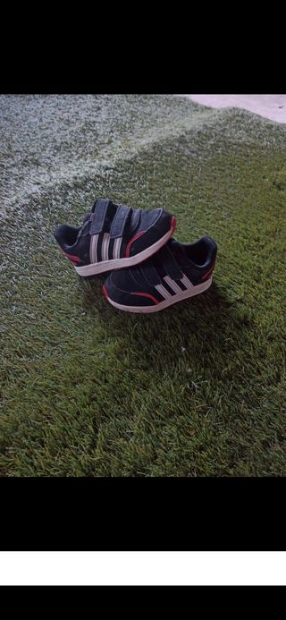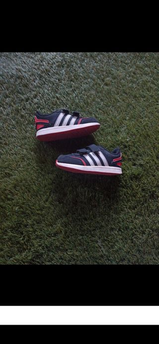 Zapatillas Adidas niño en muy buen estado salvo una incidencia mínima en una de ellas con un pequeño rozón que apenas se aprecia. Talla 24