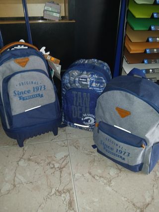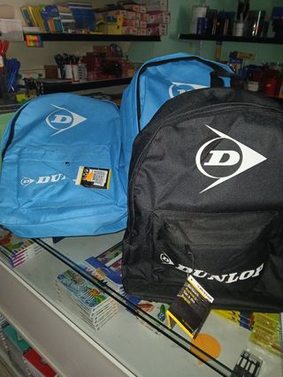 Lote de mochilas 3 de la marca tandem, un de ellas con carro incorporado que se puede desmontar, 5 mochilas dunlop de color azul y negras 3 carros adaptables a las mochilas Todas las mochilas son de 40 cm de altura, con 3 compartimentos menos ls dunlop que solo tienen una cremallera y boldillo delantero Nuevas sin estrenar con su etiqueta.