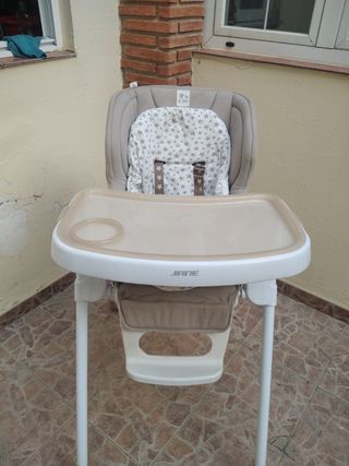 Trona de la marca Jane en color beige, con un diseño moderno y funcional. - Incluye funda acolchada con estampado de estrellas. - Bandeja extraíble. - Estructura robusta y estable.