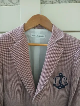 Traje de comunión para niño de la marca Mercedes de Alba. Un diseño elegante y clásico. - Chaqueta con estampado de pata de gallo en tonos burdeos y blanco. - Detalle de ancla bordada con las iniciales TFC en el pecho. - Cuello solapa y cierre de botones.