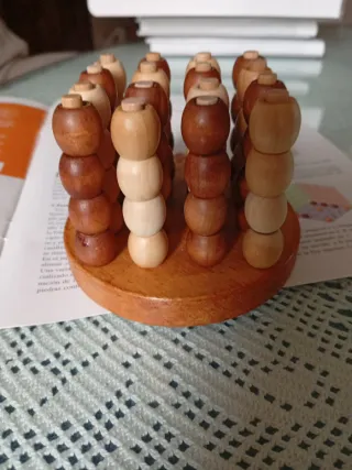 Juego de mesa clásico Cuatro en Raya fabricado en madera. Ideal para pasar un buen rato. - Base de madera circular. - Piezas de madera en dos tonos: claro y oscuro.