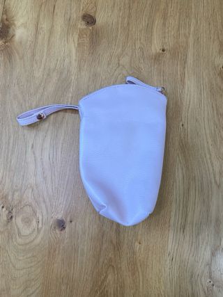 Set de dos fundas porta biberón y chupete en buen estado. - Color blanco roto. - Material polipiel. - Cierre de cremallera. - Asa de transporte. - Diseño con sello y lazo.