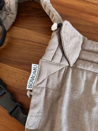 Mochila de porteo de la marca SOMOMU, ideal para llevar al bebé cómodamente. - Tejido de color beige jaspeado. - Tirantes acolchados y ajustables. - Cinturón lumbar acolchado para mayor comodidad.