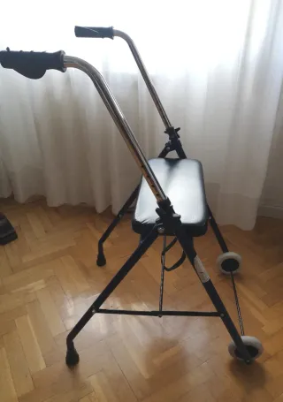 Andador plegable con asiento incorporado, ideal para facilitar la movilidad. - Estructura metálica resistente. - Asiento acolchado. - Ruedas para facilitar el desplazamiento.