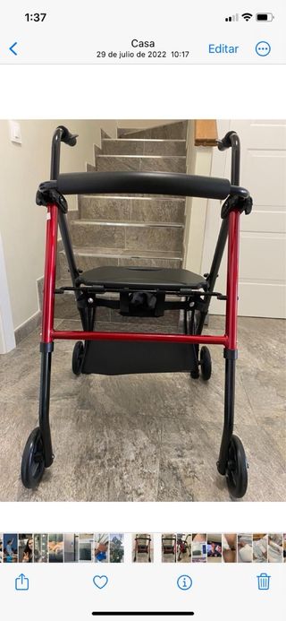 Andador ligero y práctico, ideal para facilitar la movilidad. - Estructura de metal en color rojo y negro. - Asiento incorporado. - Ruedas para un desplazamiento suave.