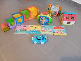 Lote variado de juguetes infantiles. - Libros de Peppa Pig: Palabras, Colores, Números y En la Playa. - Casa de juguete. - Bloques de construcción. - Coche de policía. - Juguete musical interactivo, libro musical, correpasillos y caja grande para guardar los juguetes. La caja tiene el cierre roto pero se puede tapar perfectamente. Todo el lote 50€ y también se pueden vender por unidades.