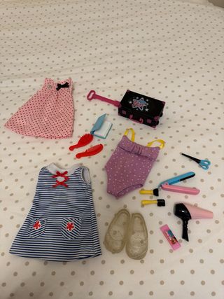 Conjunto de ropa y accesorios para muñeca Nancy: - Vestido rosa de lunares negros con lazo. - Vestido azul y blanco a rayas con bolsillos. - Bañador morado de lunares blancos. - Zapatos transparentes brillantes. - Maleta negra con ruedas y asa. - Secador de pelo rosa. - Plancha de pelo azul y rosa. - Cepillo y peine rojos. - Un libro azul. - Un paquete rosa. - Tijeras