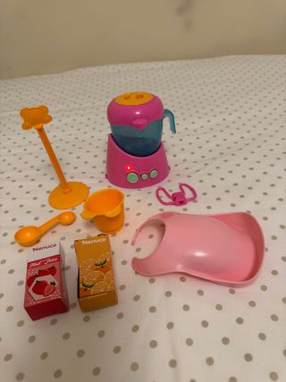 Set de juego de batidora Nenuco con varios accesorios. - Batidora de juguete en color rosa y azul. - Incluye cuchara, vaso, babero y soporte. - Dos cajas de alimentos de juguete (fresa y naranja).