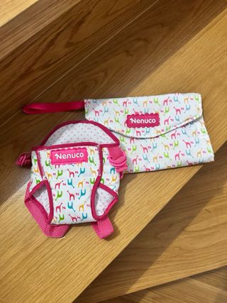 Conjunto de accesorios Nenuco. - Mochila portabebé con estampado de jirafas. - Cambiador plegable a juego con estampado de jirafas. - Muñeca no incluida.