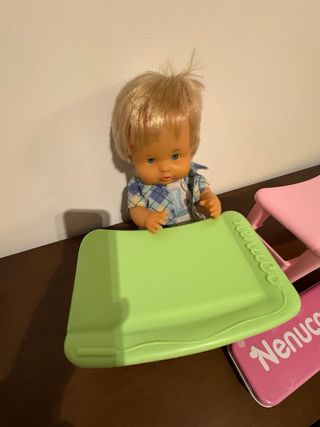 Muñeco del Set de juego Nenuco Hermanitos al cole. - Incluye un muñeco - Incluye dos mesitas, una verde y otra rosa. - Incluye un estuche metálico con diseño de Nenuco y un osito.