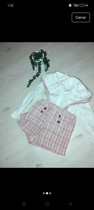 Conjunto de peto de cuadros y camisa blanca. - Peto con tirantes y botones. - Camisa de manga larga con cuello.