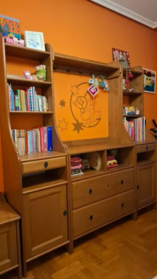 Armario con dos puertas y un cajón inferior. Dos baldas y barra para colgar. Cuna que se hace cama. Sinfonier que se hace cambiador. con dos estanterias con zona para guardar, perchero y arcon. Es de ikea. No se hacen envios. Precio negociable.