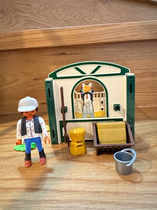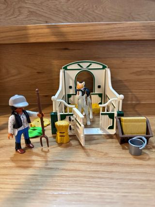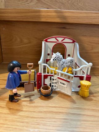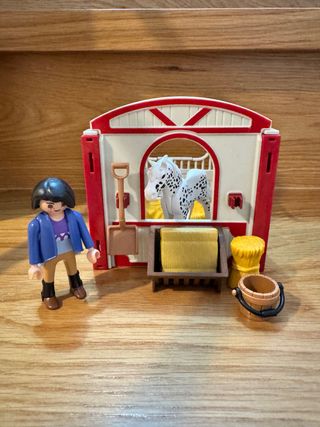 Set de Playmobil que incluye un establo, un caballo, jinete y varios accesorios. - Establo de color beige y marrón. - Caballo de color claro con silla de montar, cabezada y riendas. - Jinete con casco. - Incluye un cubo, una escoba, un fardo de heno, etc.