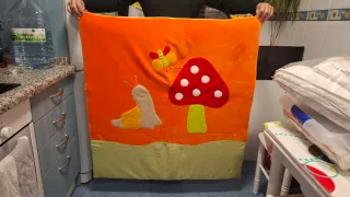 Alfombra o manta infantil con un diseño divertido y colorido. - Base de tela naranja con aplicaciones. - Figuras de un caracol, una seta y una mariposa. - Borde inferior de tela a rayas verdes. 100 % Algodón