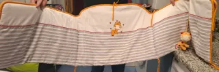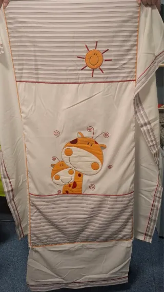Conjunto de ropa de cuna con un diseño infantil. - Incluye edredón con rellenoy chichonera. - Estampado de jirafas y sol. - Rayas finas en los bordes.