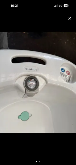 Bañera blanca para bebés de la marca OLMITOS. Incluye un práctico termómetro para controlar la temperatura del agua. - Diseño ergonómico. - Material resistente y fácil de limpiar. - Termómetro integrado.
