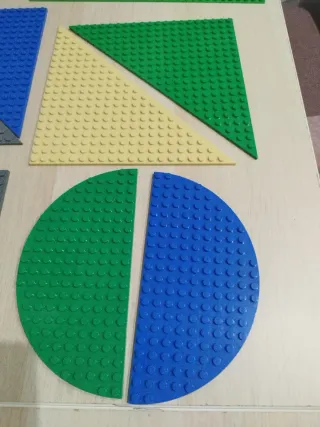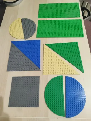 Lote de 11 bases compatibles con Lego, perfectas para construir tus creaciones. - Incluye bases de diferentes formas y colores. - Formas disponibles: rectangulares, cuadradas y circulares. - Colores: verde, azul, amarillo y gris.