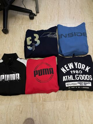 Lote de seis sudaderas para niño con diferentes diseños y marcas. - Sudadera azul marino con estampado 33 y Nothing is impossible. - Sudadera azul con estampado INSIDE. - Chaqueta deportiva negra y blanca con logo PUMA. - Sudadera roja con logo circular PUMA. - Sudadera azul marino con estampado NEW YORK 1980 ATHL.GOODS. - Sudadera azul marino con estampado YOUTH. Edad 13-16 años aproximadamente
