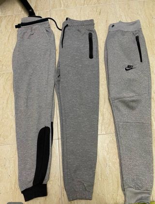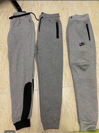 Conjunto de tres pantalones deportivos de color gris. - Uno de ellos tiene detalles en negro en el lateral y el tobillo. - Dos de los pantalones cuentan con bolsillos con cremallera. - Uno de los pantalones tiene el logo de Nike.