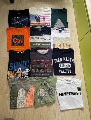Lote de 12 camisetas de manga corta para niño. - Camiseta negra con diseño gráfico. - Camiseta blanca con diseño de bandera americana y palmeras. - Camiseta verde oscuro con diseño geométrico. - Camiseta naranja con texto Ctrl. - Camiseta azul marino con texto Skatepark Riders. - Camiseta blanca con diseño abstracto. - Camiseta negra con diseño de Sonic. - Camiseta gris oscuro con diseño de fechas y horas. - Camiseta azul marino con texto Team Master Varsity. - Camiseta gris con diseño de tablas de surf. - Camiseta verde con diseño de T-Rex. - Camiseta blanca con logo de Minecraft.