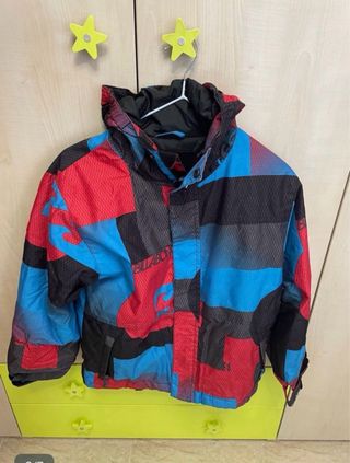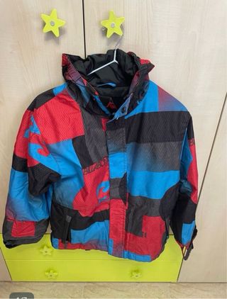 Chaqueta de nieve para niño de la marca Billabong. Diseño colorido y moderno. - Estampado geométrico en rojo, azul y negro. - Capucha integrada. - Cierre frontal con cremallera y botones. - Bolsillos laterales.
