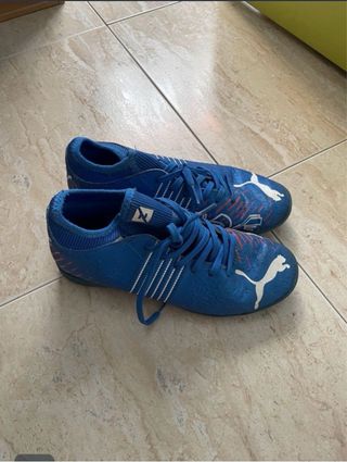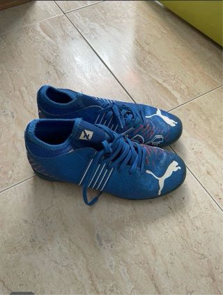 Botas de fútbol Puma para niño en color azul. - Cierre con cordones. - Detalle de rayas blancas y detalles en naranja. - Logo de Puma en blanco.
