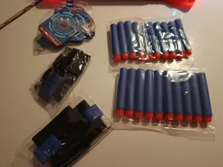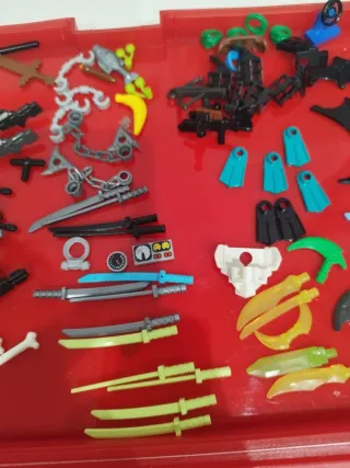 Lote de accesorios originales de Lego. - Incluye espadas, cadenas, armas, botellas y aletas de buzo y otros elementos. - Piezas variadas para construcción y juego.