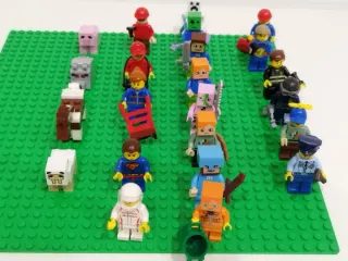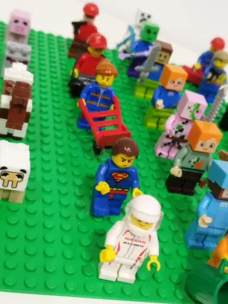 Conjunto variado de figuras Lego, incluyendo personajes de Minecraft. - Figuras de Minecraft: cerdo, oveja, creeper, Alex, Steve. - Figuras de Superman, policías, turistas,... - Accesorios incluidos. 📢No incluido la base verde.