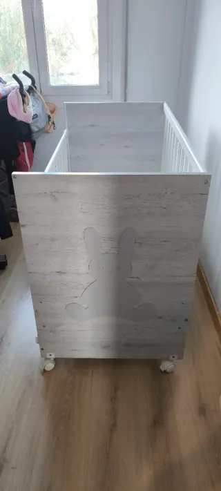 Cuna de bebé fabricada en madera con un encantador diseño de conejo. - Estructura de madera. - Varias posiciones de un lateral - Diseño con detalles de conejo. - Colchón incluido anti asfixia incluido - Regalo también de cojín maternidad marca Koala y almohada anti asfixia