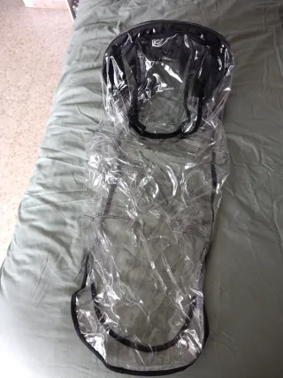 Protector de lluvia transparente para cochecito. - Material de plástico resistente. - Ribete negro. - Cierre de velcro.