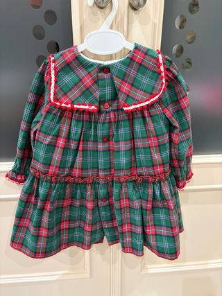 Vestido de cuadros verdes y rojos para niña, ideal para ocasiones especiales. - Diseño de manga larga. - Cuello con detalle de pompón y ribete. - Falda con volantes.
