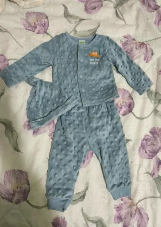 Conjunto de ropa de bebé de punto en color azul, ideal para los más pequeños. Incluye gorro y pijama. - Tejido suave y confortable. - Diseño clásico con detalles. - Incluye gorro a juego. - Pijama con pies incorporados.