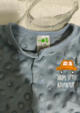 Conjunto de tres piezas para bebé en suave tejido minky azul. - Incluye gorrito, chaqueta y pantalón. - Chaqueta con botones delanteros. - Diseño con estampado de cochecito y texto Dad's Little Adventure.