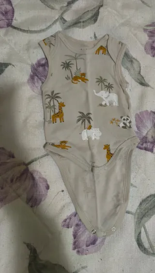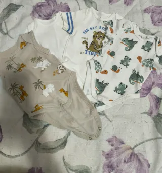 Conjunto de cuatro bodies para bebé con divertidos estampados de animales. - Body blanco con rayas azules y dibujo de tigre. - Body blanco con estampado de ranas, tortugas y caracoles. - Body beige con estampado de animales de la selva (jirafas, elefantes, hipopótamos, leones y pandas). - body blanco.