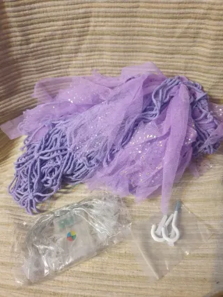 Hamaca parecida a la de la foto de tela morada con detalles brillantes, ideal para colgar peluches o juguetes. Incluye luces LED y ganchos para su instalación. Tela de tul morada con estrellas doradas. - Cuerdas de lana morada. - Luces LED con caja de pilas. - Dos ganchos de sujeción.