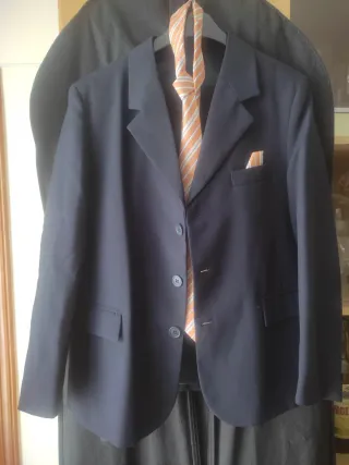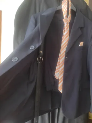 Traje de comunión completo en color azul marino. Incluye chaqueta, pantalón, cinturón y corbata. Solo se uso para la ceremonia. Negociable. - Chaqueta de vestir con dos botones. - Bolsillos frontales. - Corbata a rayas naranjas y blancas. - Pañuelo a juego.