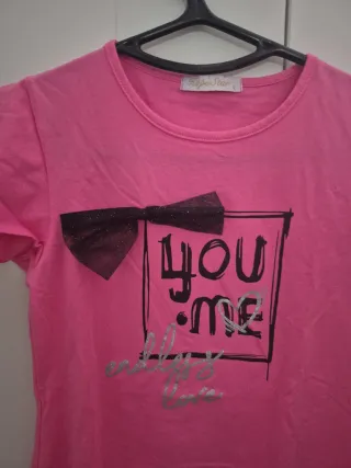 Camiseta de manga corta para niña en color rosa. - Diseño con lazo negro en la parte delantera. - Estampado you me en la zona del pecho. - Mangas con volantes.