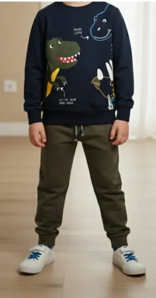 Conjunto de ropa infantil con estampado de dinosaurios. - Sudadera azul marino. - Pantalón verde militar.