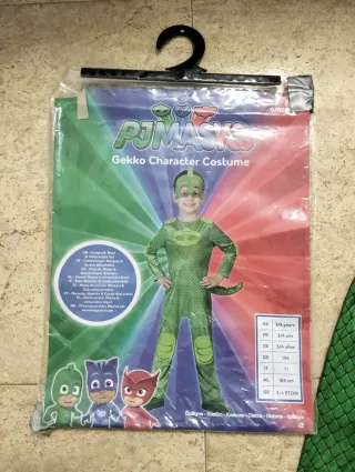 Disfraz del personaje Gekko de Pjmasks. - Talla 3-4 años. - Incluye mono, máscara y cola. - Diseño verde con escamas.