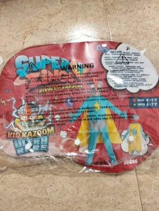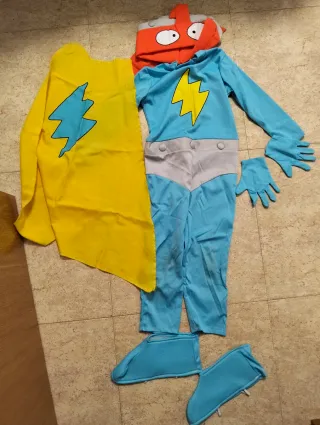 Disfraz del personaje Kazoom Kids para niños de 4 a 5 años. Incluye varios elementos para completar el look. - Disfraz de cuerpo completo azul con detalles grises y rayo amarillo. - Capa amarilla con rayo azul. - Guantes azules. - Cubrebotas azules. - Máscara o capucha naranja con ojos.