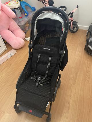 Silla de paseo Maclaren en color negro. Es ligera y fácil de plegar. - Asiento acolchado. - Arnés de seguridad. - Capota. - Ruedas delanteras giratorias.
