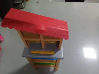 Gallinero de juguete de Barbie con tres niveles. - Estructura de plástico. - Techo rojo. - Niveles con diferentes compartimentos.